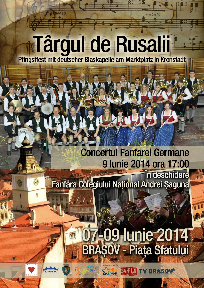Ganz wichtig sind natürlich die musikalischen Auftritte der Blaskapelle: am Pfingstsonntag im Gottesdienst in der ev. Kirche in Wolkendorf/Vulcan mit anschließendem Empfang und Konzert in der Kirchenburg; am Pfingstmontag (im orthodoxen Rumänien kein Feiertag) im Gottesdienst in der Kirchenburg von Zeiden/Codlea, wo auch der junge Pfarrer Andreas Hartig persönlich die Betreuung übernehmen wird, und am selben Tag nachmittags vor sicher sehr großem Publikum ein öffentliches Konzert auf dem eindrucksvollen Stadtplatz von Kronstadt/Brasov, organisiert durch den Stadtrat des Deutschen Forums und Leiters der Kronstädter Tourismus-Agentur, Cristian Macedonschi. Den krönenden Abschluß bildet dann am Freitag (13.6.14) der gemeinsame Auftritt mit den rumänischen Tänzern und Musikern im Kulturhaus von Zeiden/Codlea. Hermann Kurmes hat mit dafür gesorgt, daß nicht nur in Kronstadt, sondern auch in allen sächsischen Gemeinden Süd-Siebenbürgens (Burzenland/Tara Barsei) Werbung für diesen Auftritt gemacht wird.