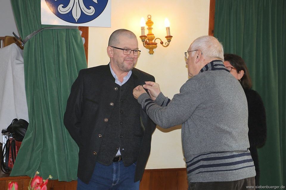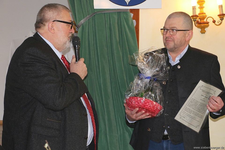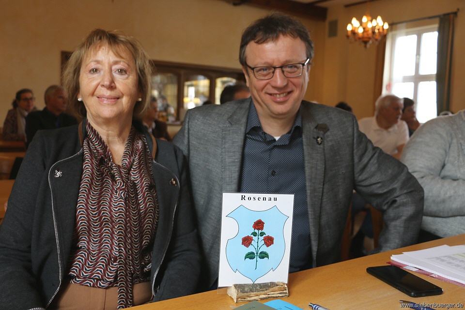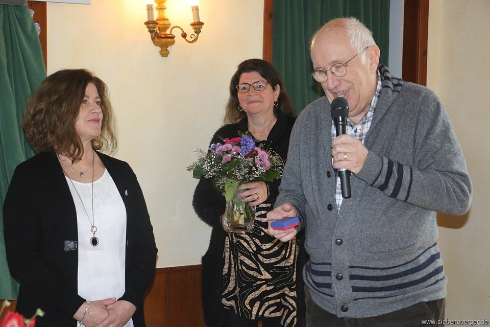 Dr. Horst Müller, stellvertretender Vorsitzender des HOG-Verbandes, überbrachte beste Grüße seitens des Vorstandes und zeichnete zwei verdiente Amtsträger mit der Silbernen Ehrennadel des HOG-Verbandes aus: Doris Martini, stellvertretende Sprecherin der Burzenländer Regionalgruppe und stellvertretende Vorsitzende der HOG Wolkendorf, sowie Klaus Foof, Kassenwart der Regionalgruppe und stellvertretender Vorsitzender der HOG Nußbach. Sichtlich gerührt dankten beide. Klaus Foof fügte hinzu: „Eine Ehrung bekommt man nie allein, da steht immer die Familie und eine HOG dahinter.“