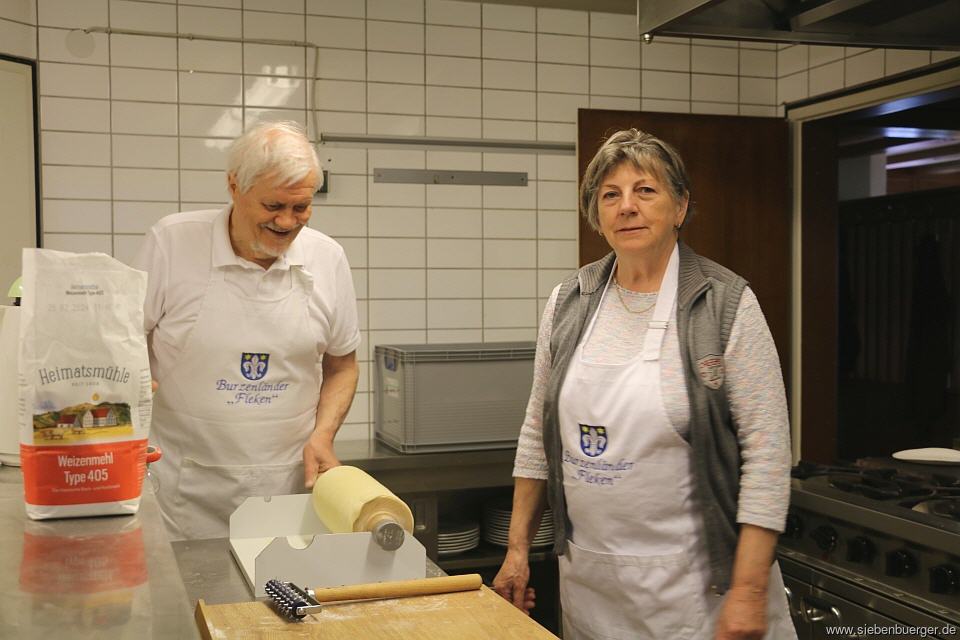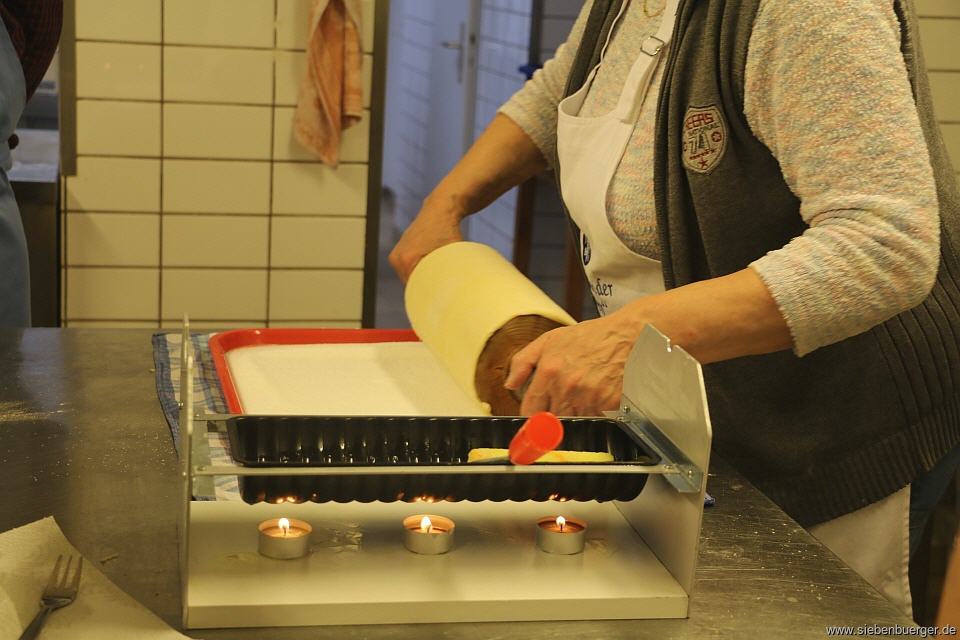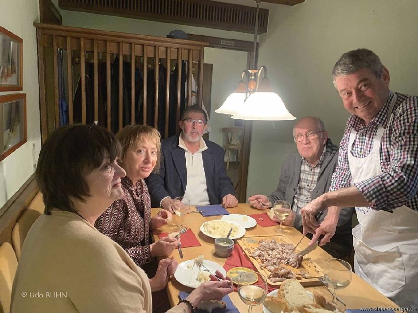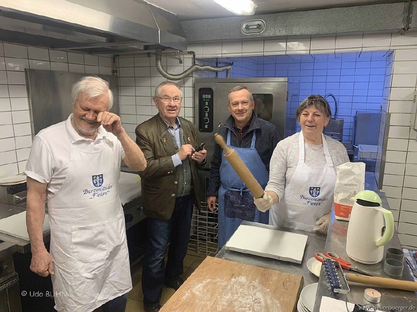 Das Kulinarische kam auch nicht zu kurz. Nachdem bei der vorigen Tagung der Workshop „Baumstriezel backen leicht gemacht“ stattgefunden hatte, ließ es sich Karl-Heinz Brenndörfer, Ehrenmitglied der Regionalgruppe, nicht nehmen, uns wieder mit vor Ort gebackenem Baumstriezel zu verwöhnen. Renate und Helfried Götz hatten das Zubereiten des traditionellen Flekens übernommen.